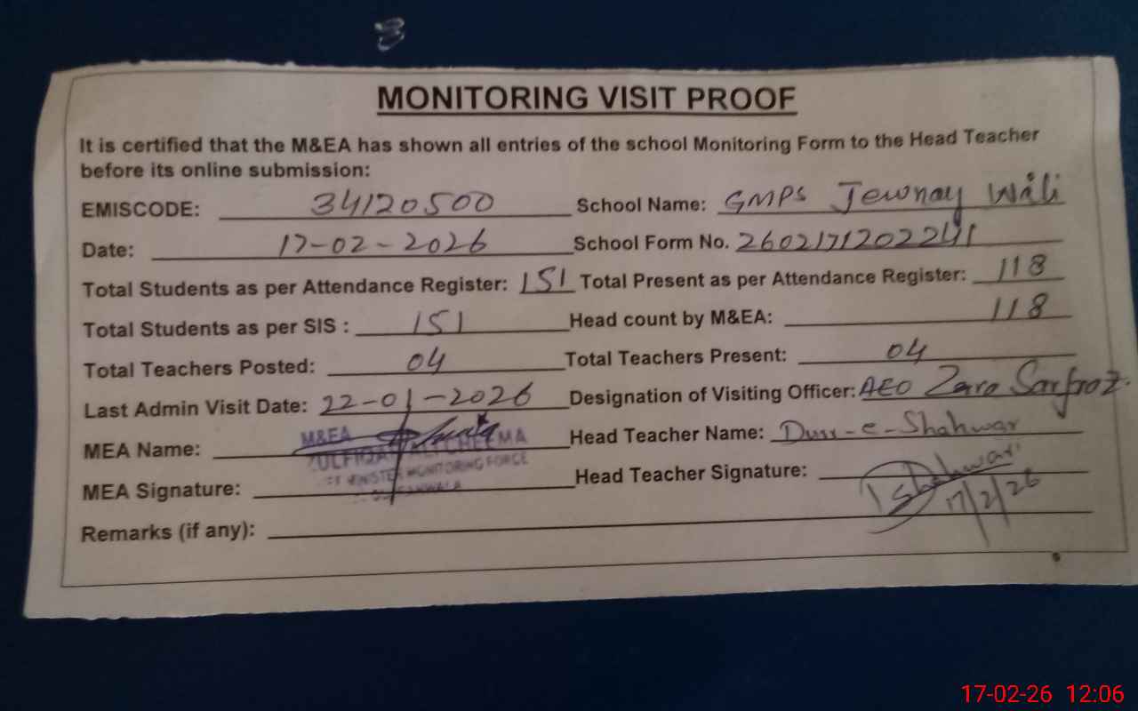 | EMIS Code: 34120500 | Name of School: GMPS JEWANY WALI | |||