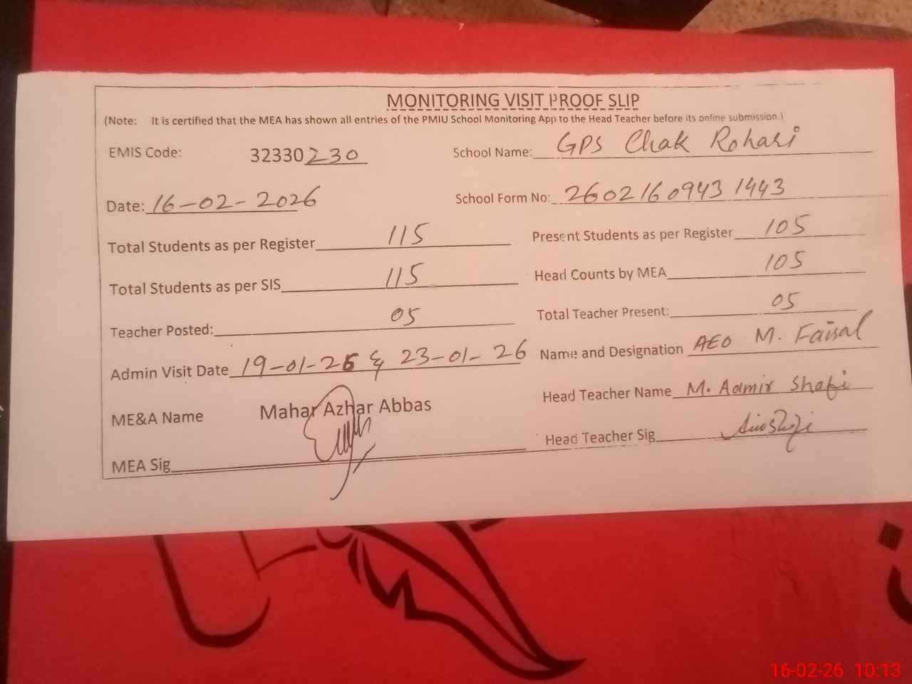 | EMIS Code: 32330230 | Name of School: GPS CHAK ROHARI | |||