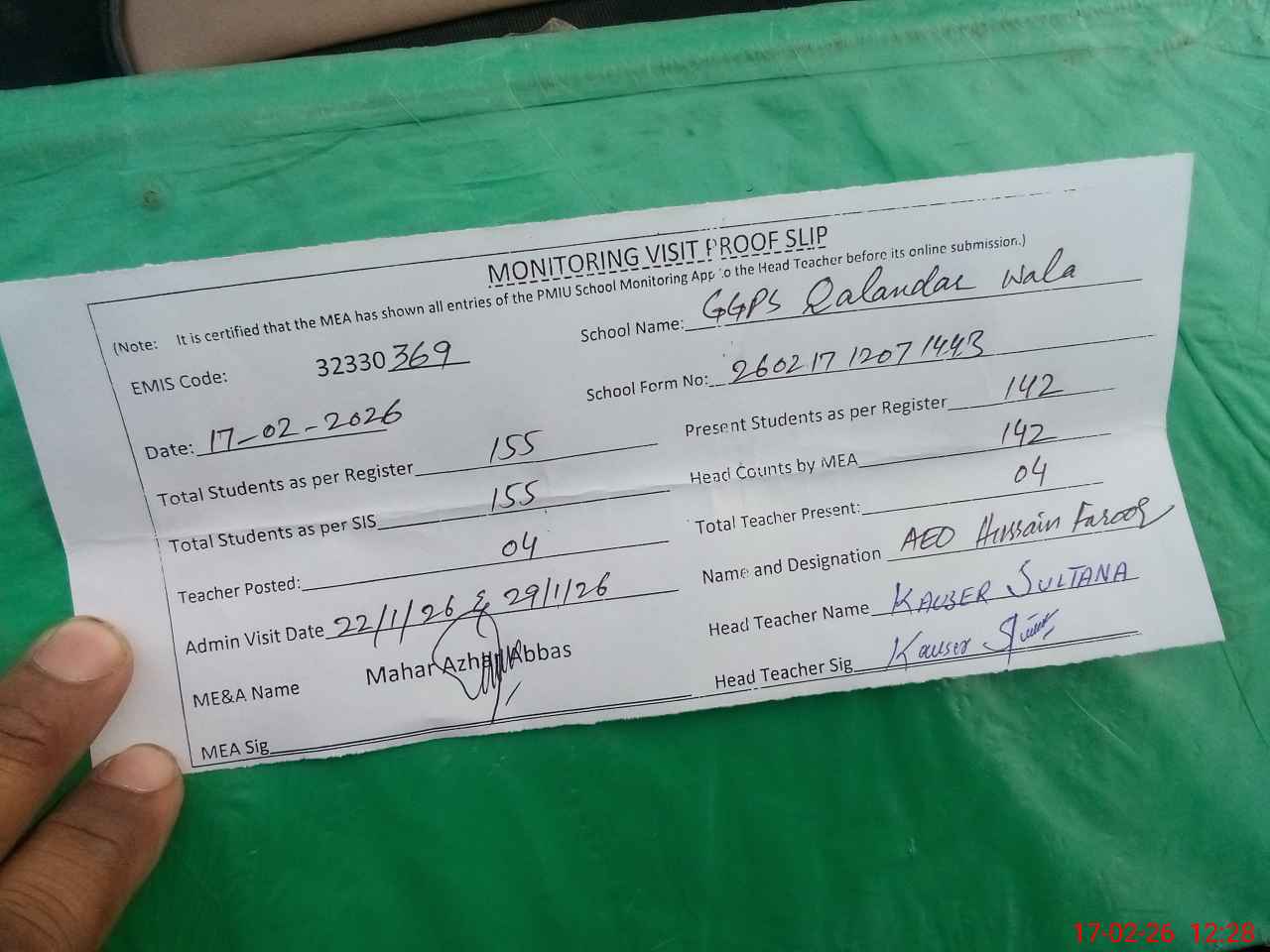 | Attendance Register | Head Teacher | MEA with School | Visit Proof |