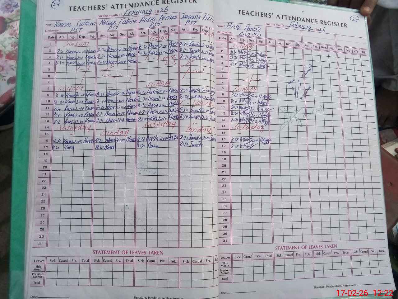 | Leave | Duty | Absent | Maternity | Medical | Ex- Pak |