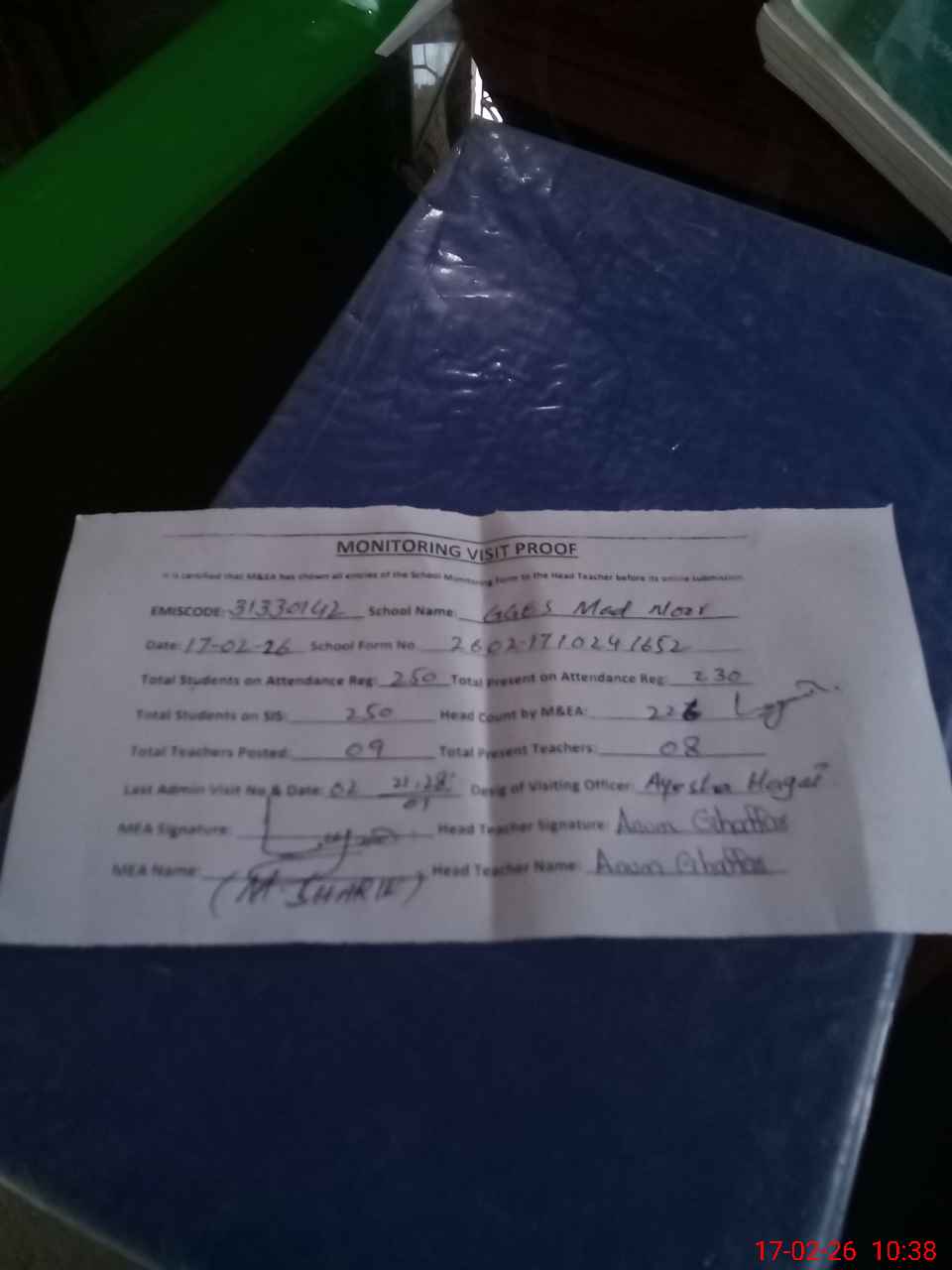| Remarks (Use Separate Page if Required): NSB Cash book not available in school record not found barbed wire broken repair needed 02 toilets non functional 04 classrooms roofing dangerous and being used for teaching | |||||
