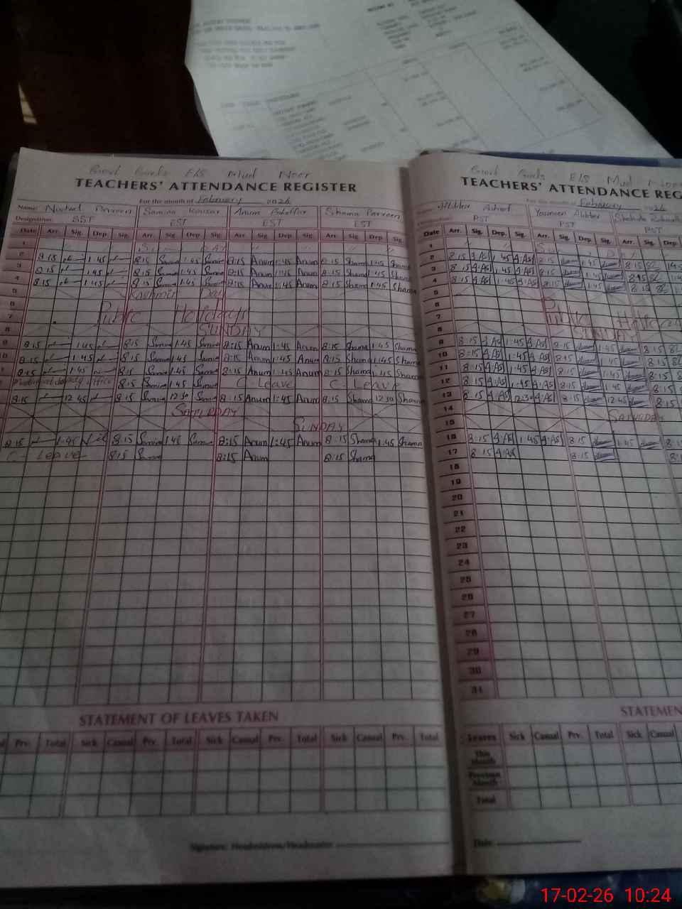 | Total no. of Classrooms: 9 No. of Classrooms Used for Teaching: 4 No. of Classrooms Storing Old Furniture, FTBs, etc: 0Comments if Any: NSB Cash book not available in school record not found barbed wire broken repair needed 02 toilets non functional 04 classrooms roofing dangerous and being used for teaching |