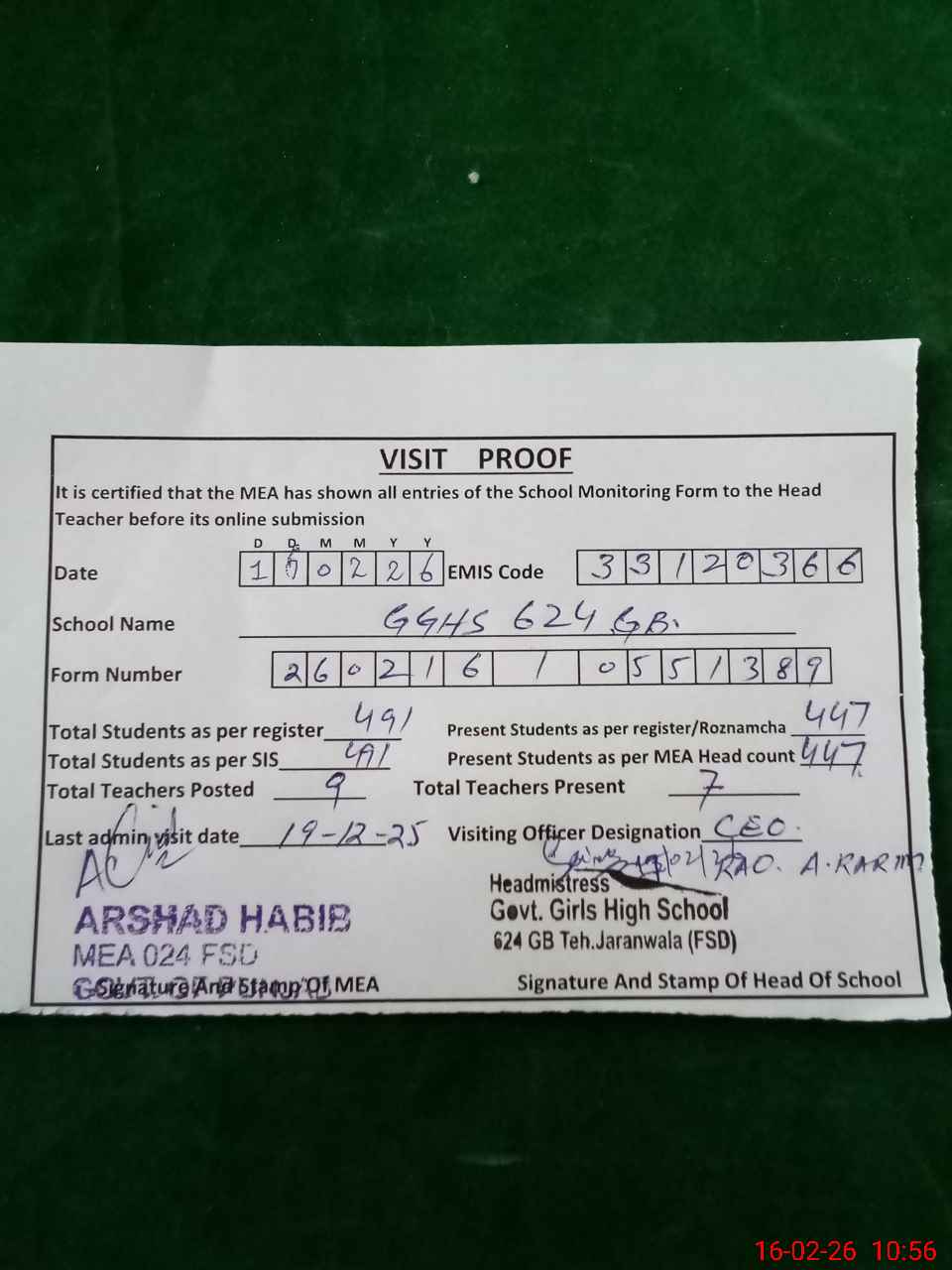 | Certified that this School was Inspected by the Undersigned MEA/DMO Today and the Information Stated Above is as Per Record. | |||||