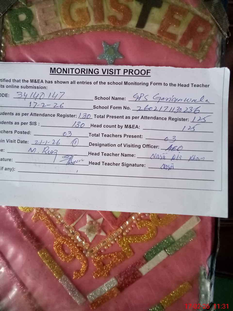 | Attendance Register | Head Teacher | MEA with School | Visit Proof |