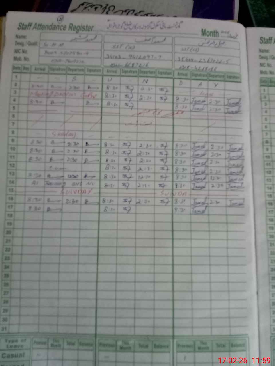| CNIC | Full Name | Designation | R/C | Absence During Last Calender Month |