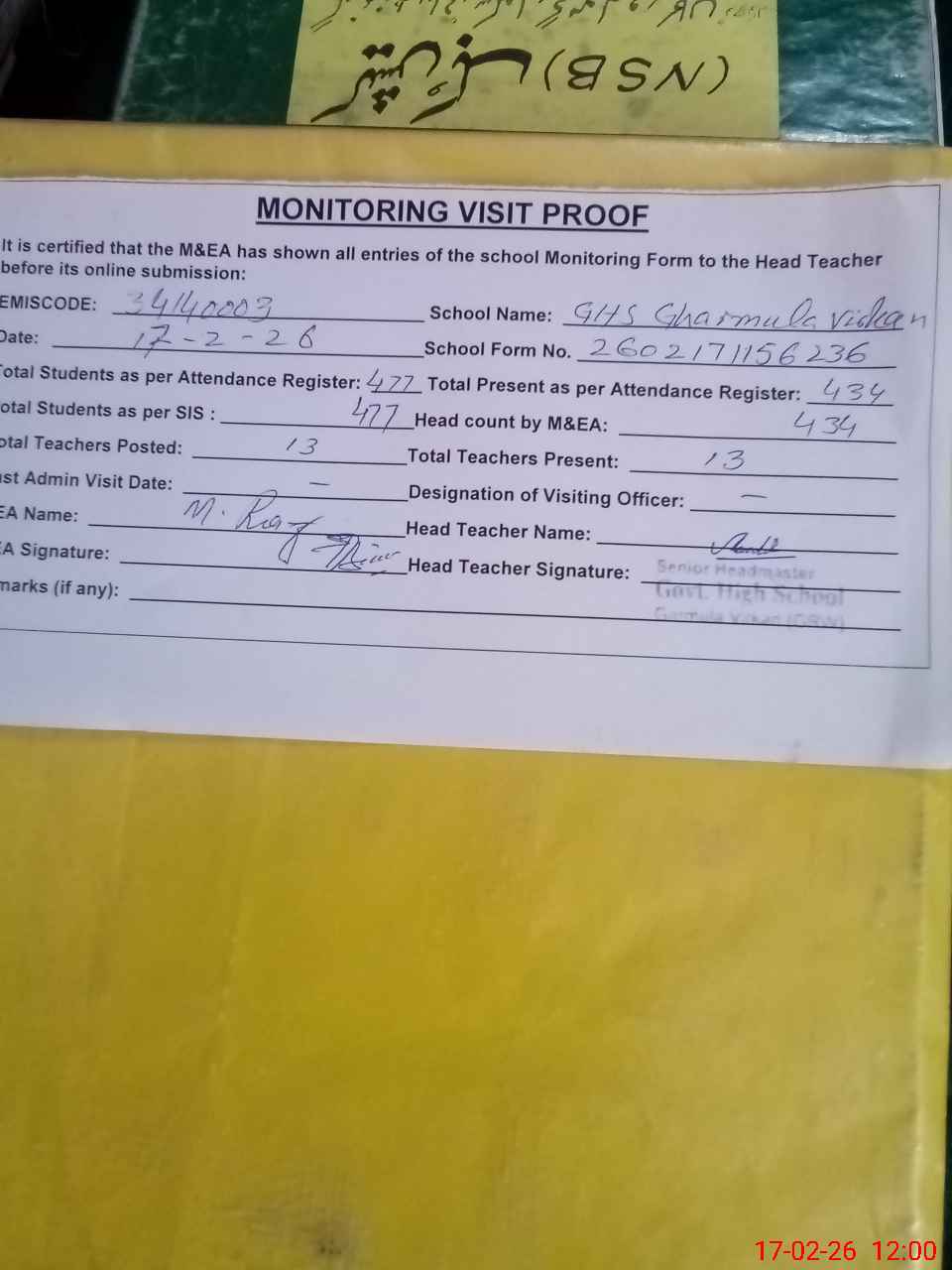 | Attendance Register | Head Teacher | MEA with School | Visit Proof |