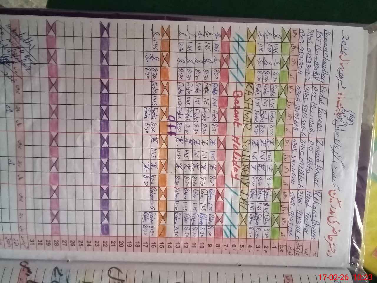 | No. of Students Present - Female | 0 | 9 | 17 | 10 | 15 | 13 | 6 | 102 | ||||||||