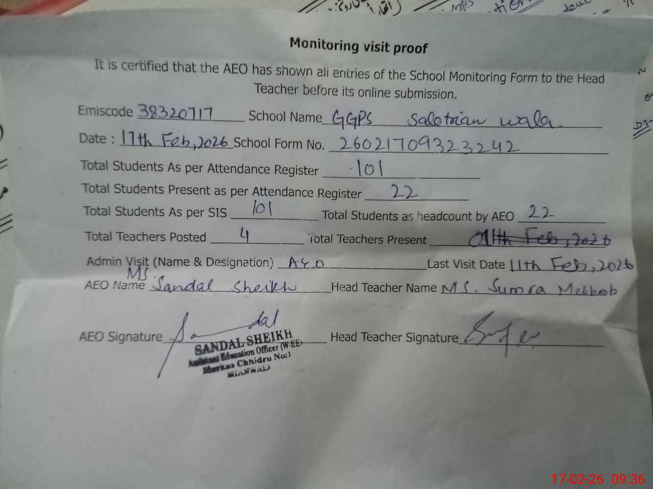 | Attendance Register | Head Teacher | MEA with School | Visit Proof |