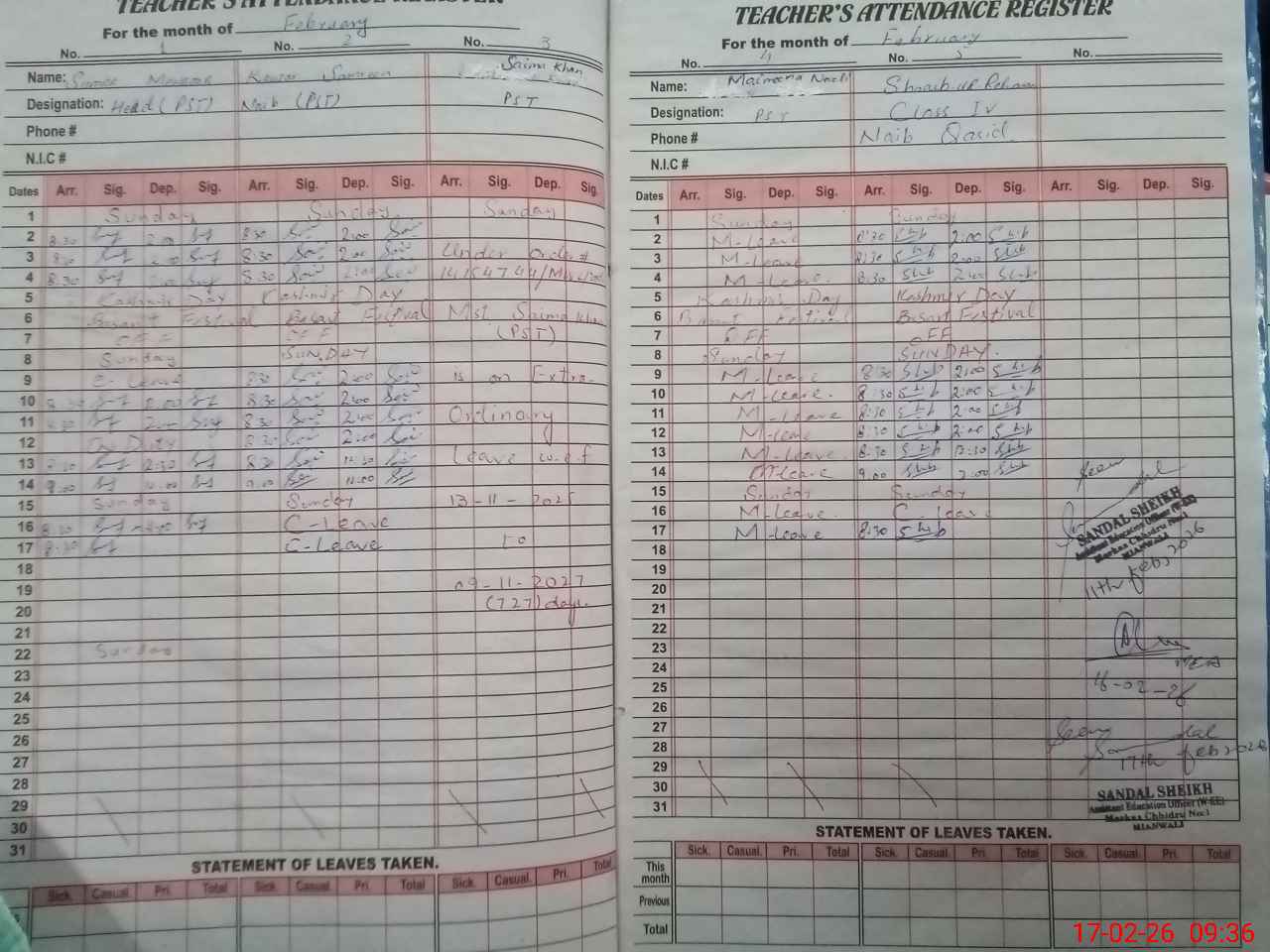 | CNIC | Full Name | Designation | R/C | Absence During Last Calender Month |