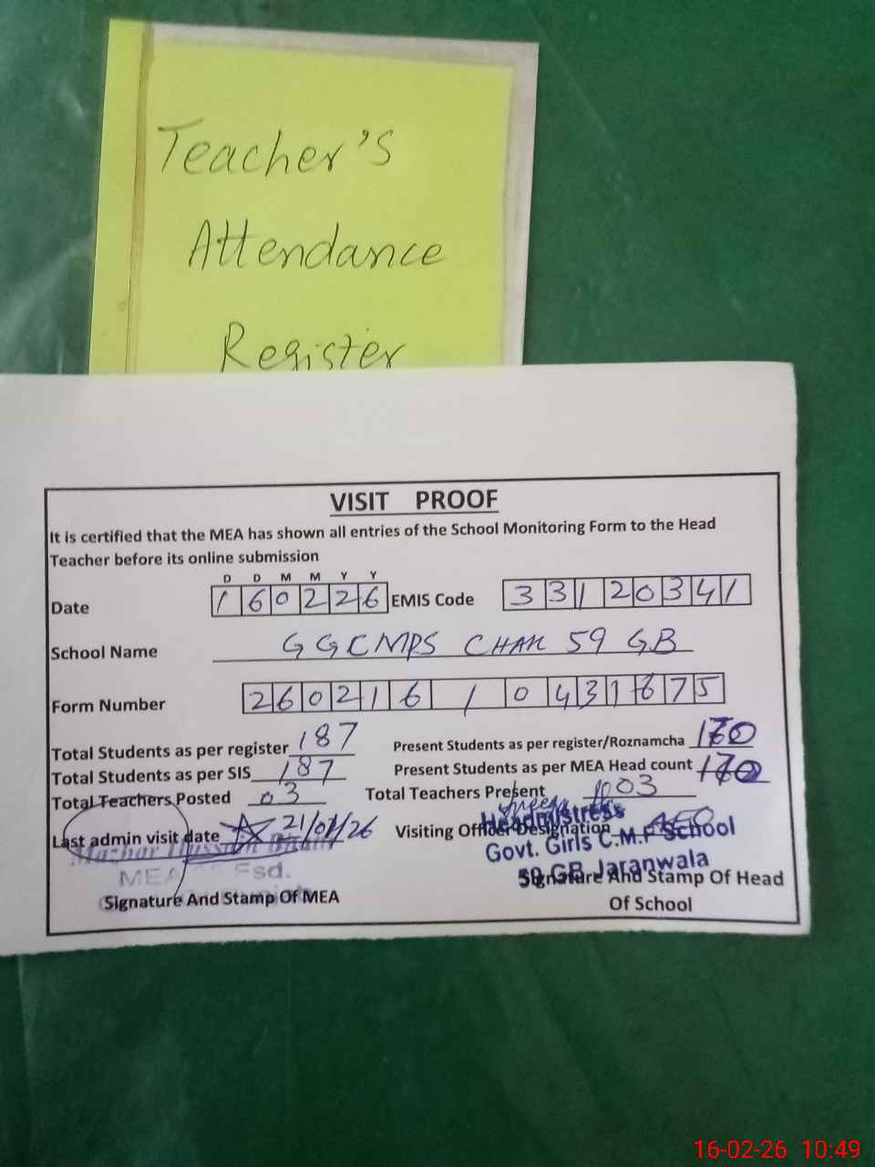 | EMIS Code: 33120341 | Name of School: GGCMS CHAK 59 GB JARANWALA | |||