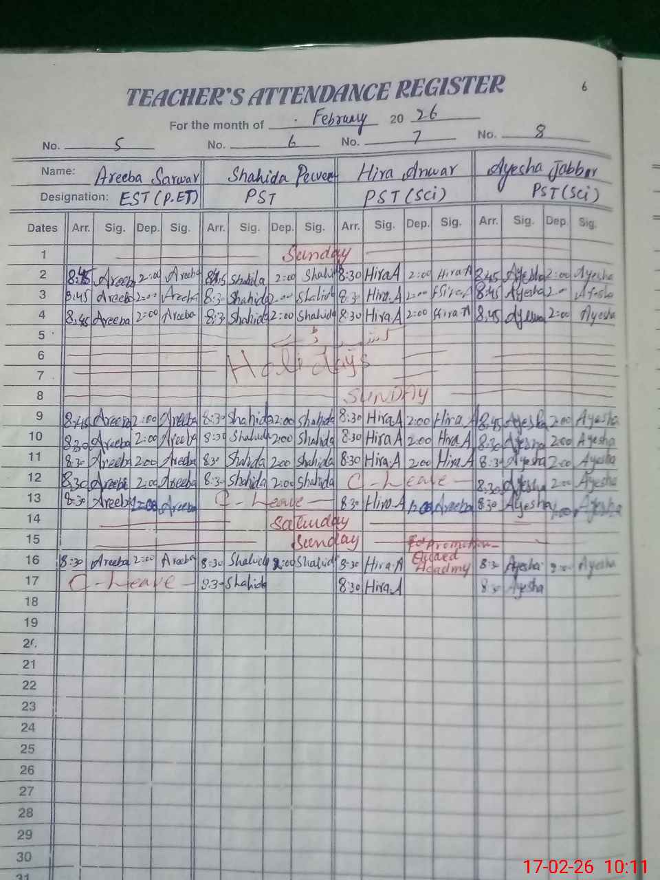 | Leave | Duty | Absent | Maternity | Medical | Ex- Pak |