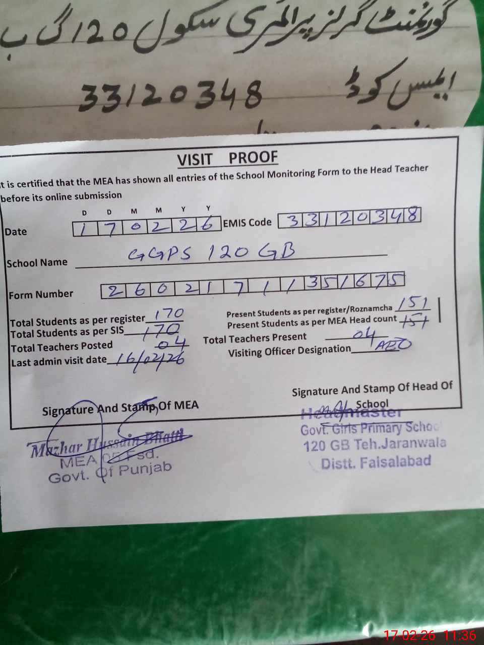 | EMIS Code: 33120348 | Name of School: GGPS CHAK 120 GB JARANWALA | |||