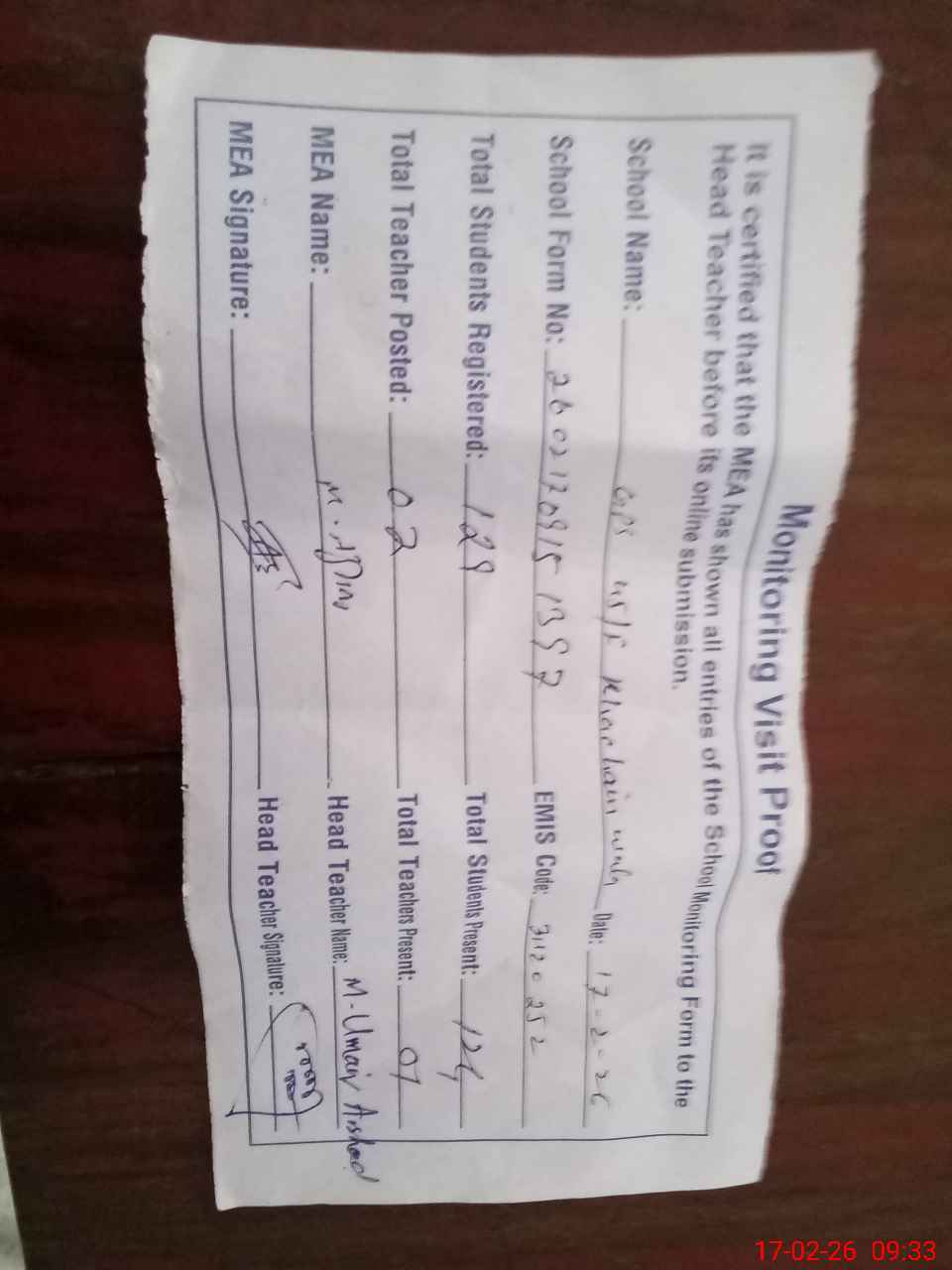 | Attendance Register | Head Teacher | MEA with School | Visit Proof |