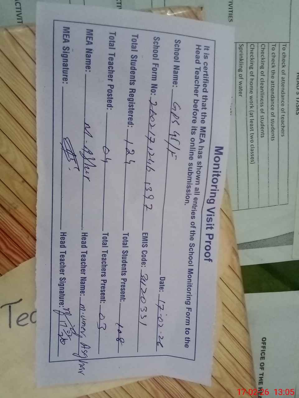 | Attendance Register | Head Teacher | MEA with School | Visit Proof |