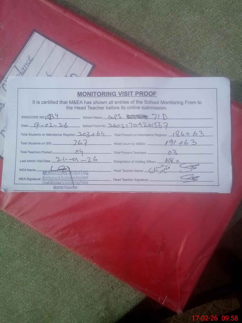 | Attendance Register | Head Teacher | MEA with School | Visit Proof |