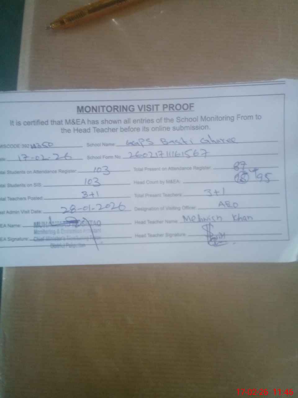 | Attendance Register | Head Teacher | MEA with School | Visit Proof |