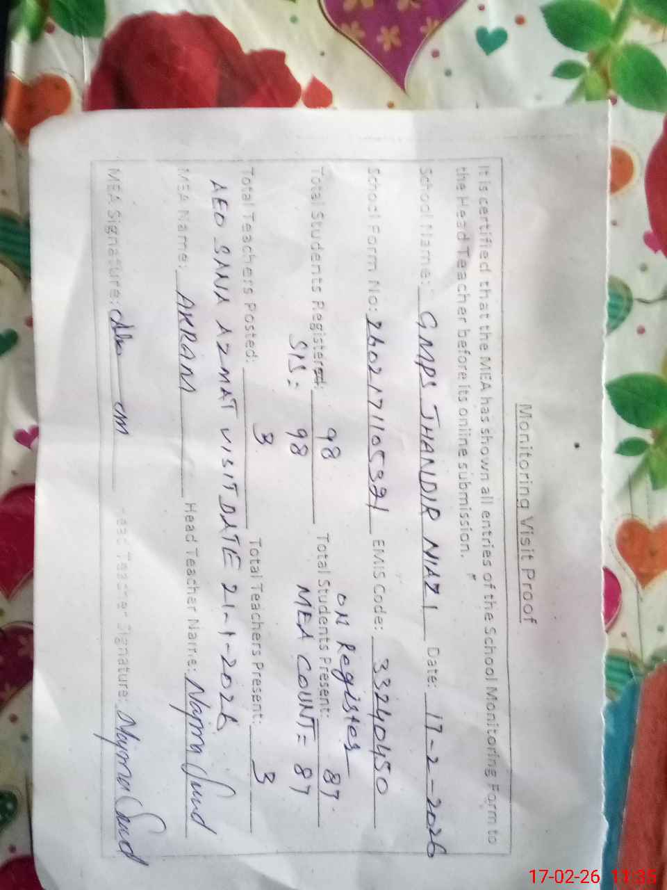 | Attendance Register | Head Teacher | MEA with School | Visit Proof |