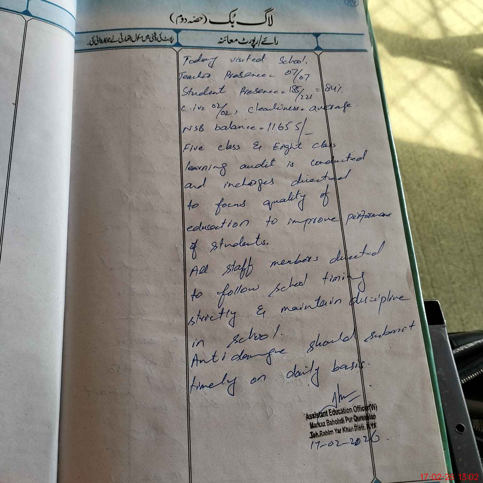 | Certified that this School was Inspected by the Undersigned MEA/DMO Today and the Information Stated Above is as Per Record. | |||||