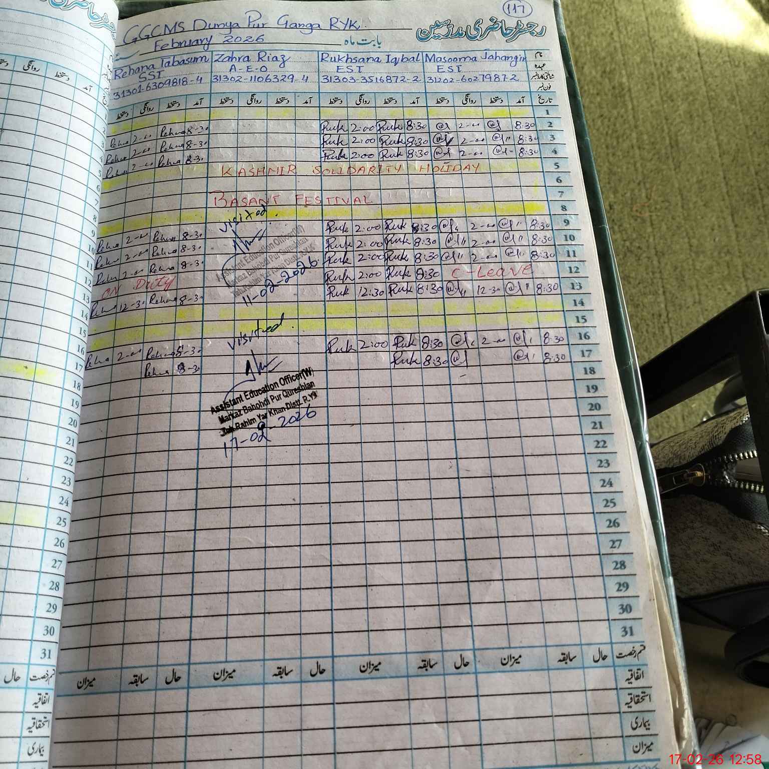 | CNIC | Full Name | Designation | R/C | Absence During Last Calender Month |
