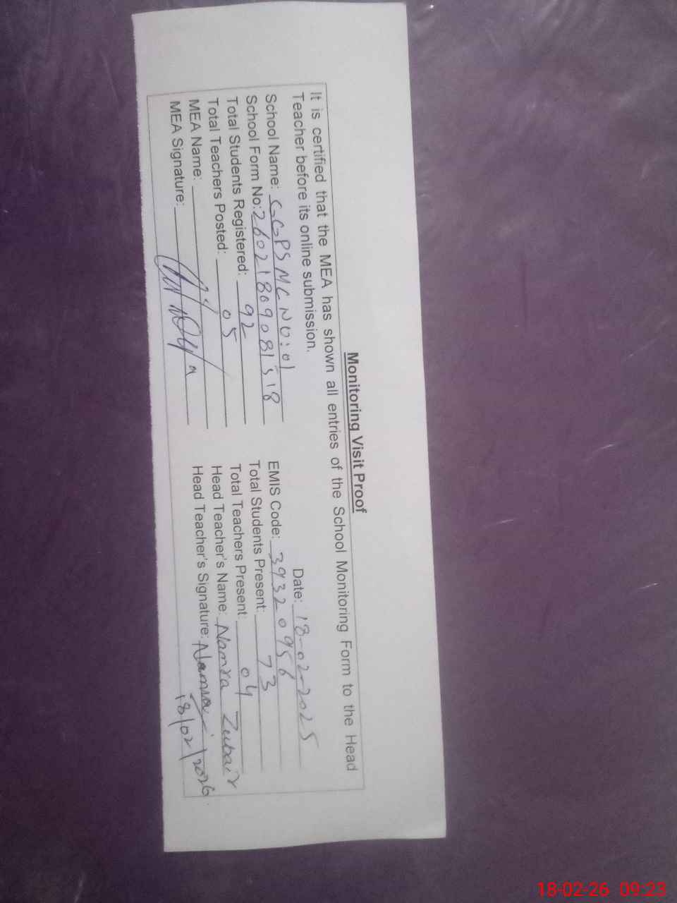 | Attendance Register | Head Teacher | MEA with School | Visit Proof |