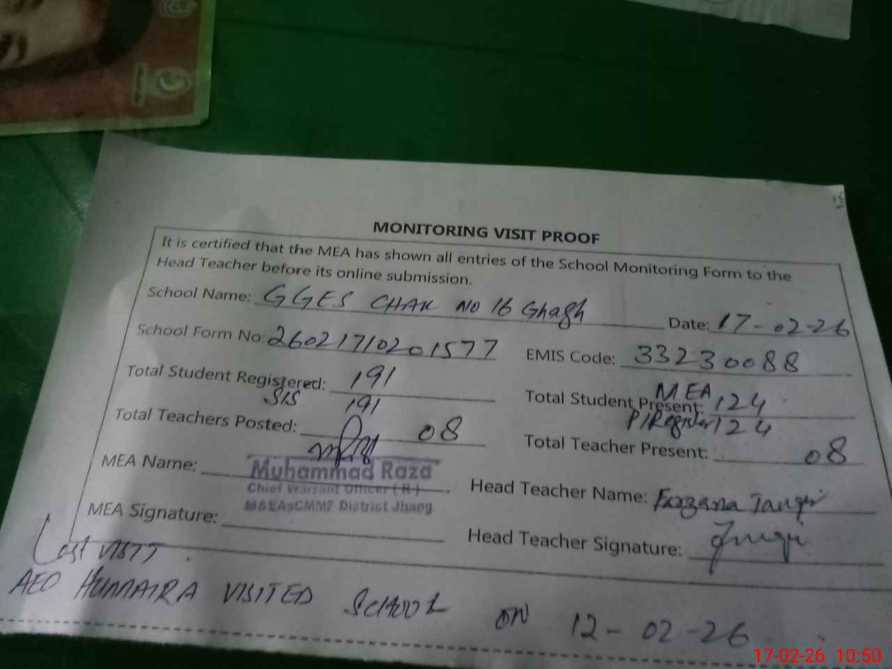 | EMIS Code: 33230088 | Name of School: GGES CHAK NO 16 GHAGH | |||