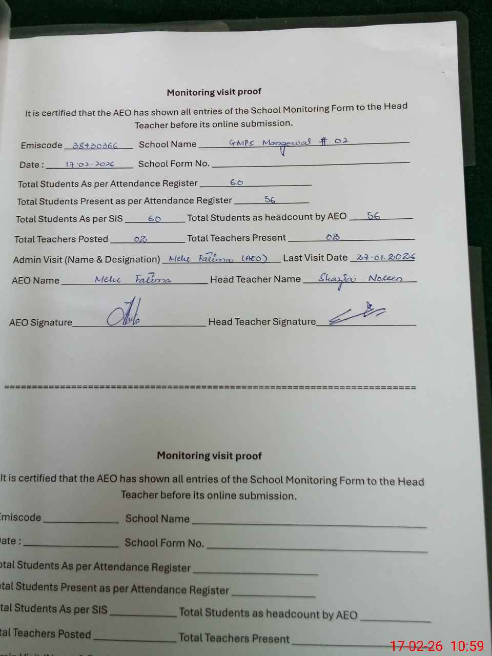 | Certified that this School was Inspected by the Undersigned MEA/DMO Today and the Information Stated Above is as Per Record. | |||||
