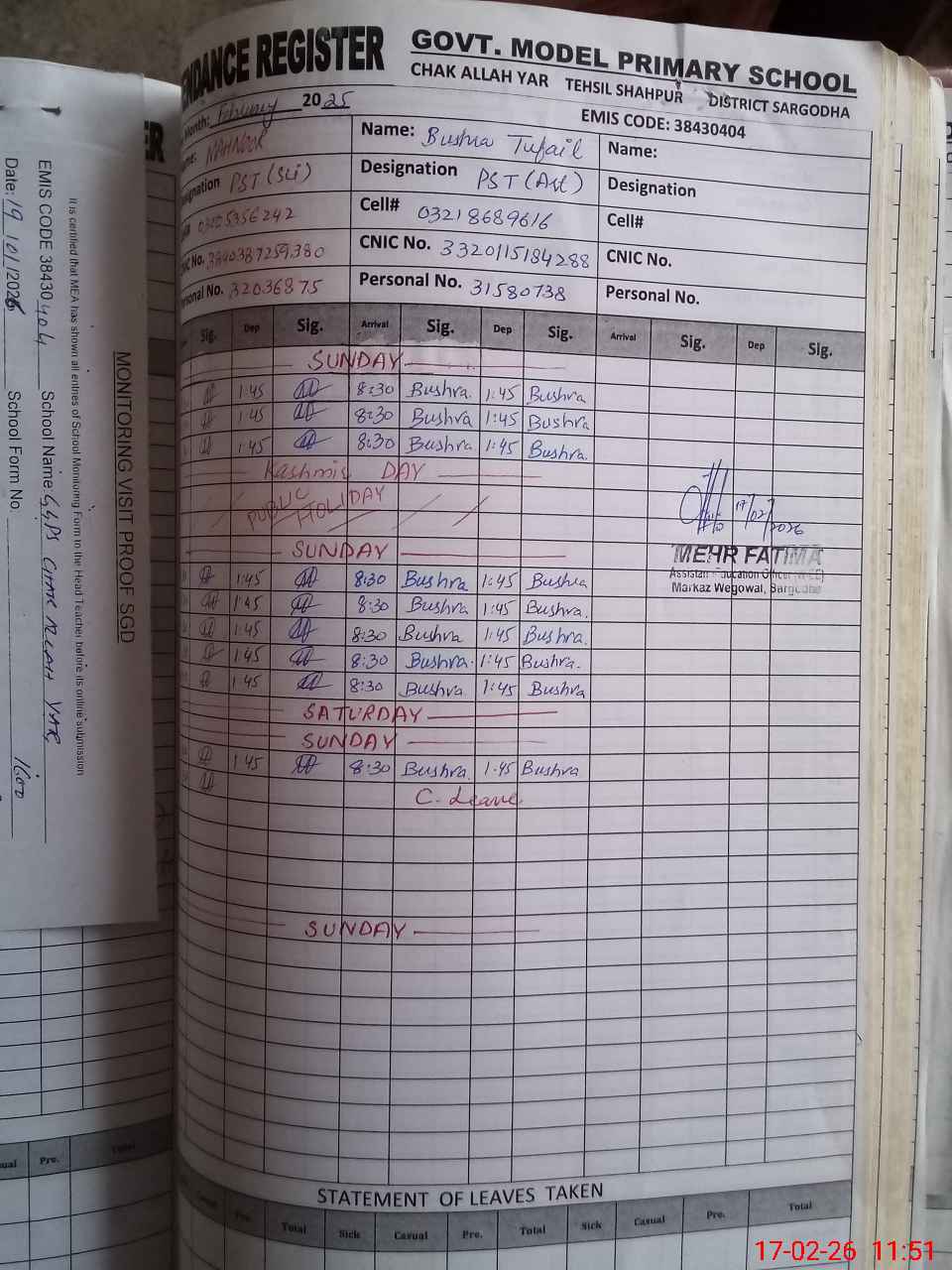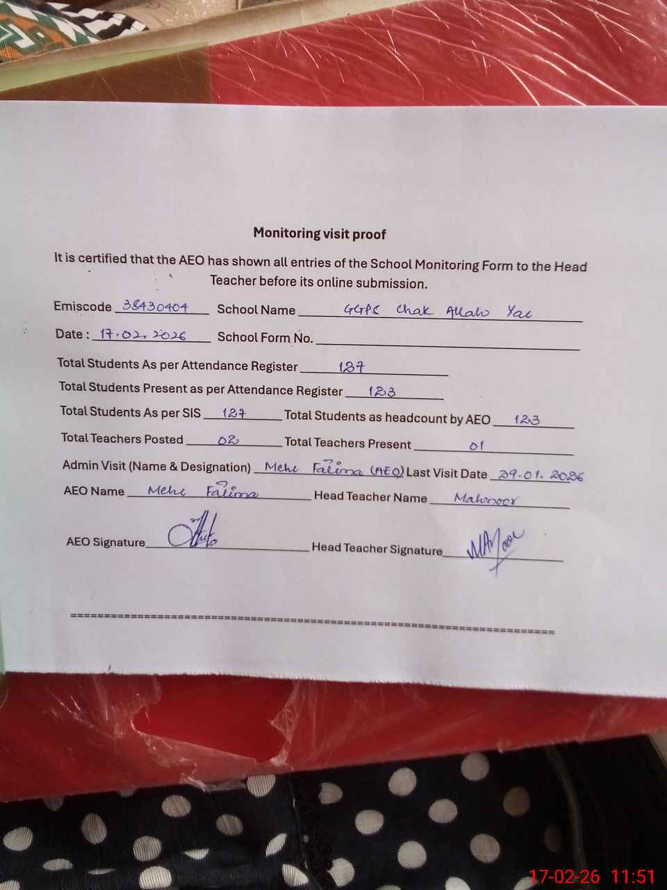 | Attendance Register | Head Teacher | MEA with School | Visit Proof |
