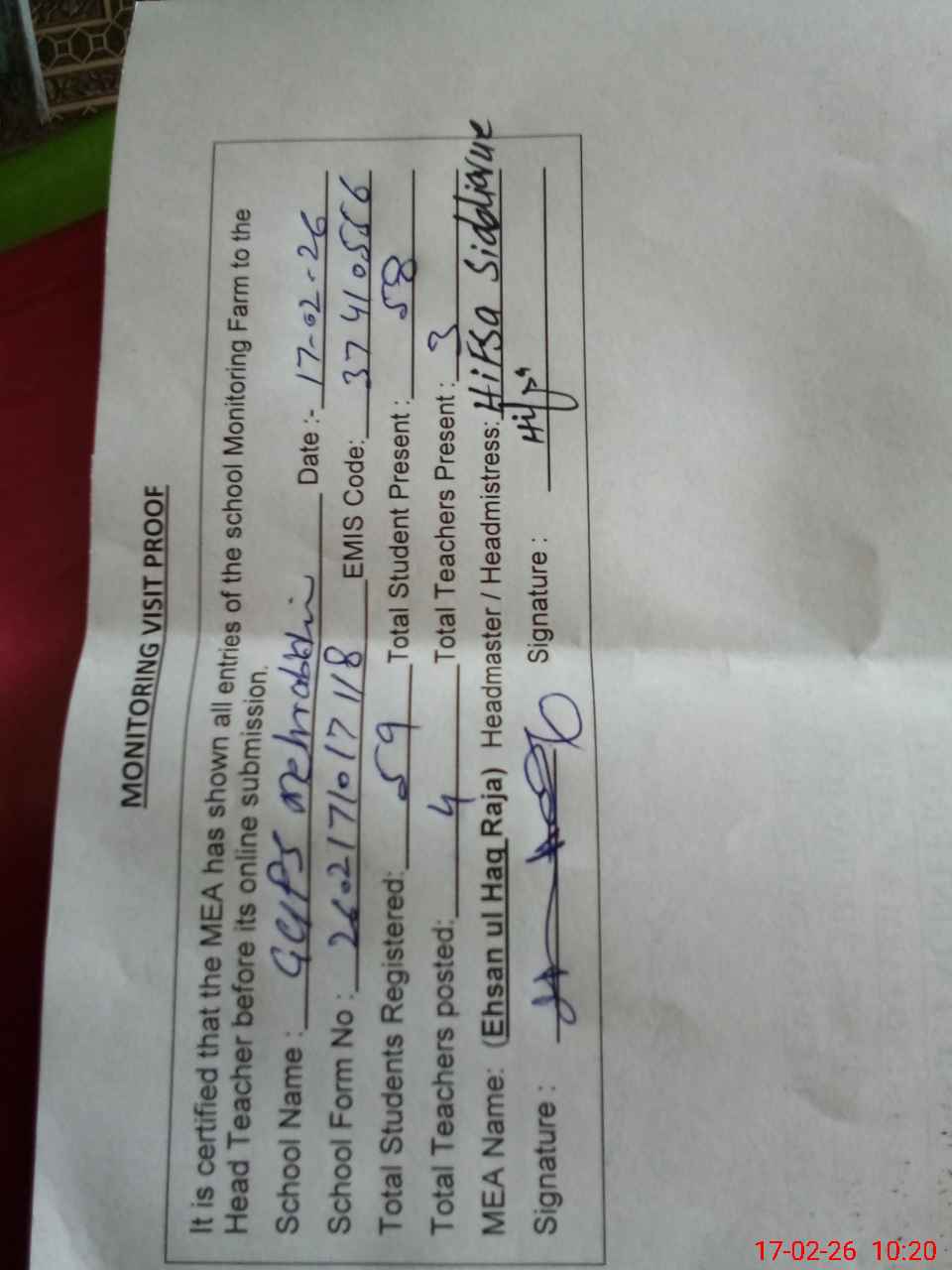 | Attendance Register | Head Teacher | MEA with School | Visit Proof |