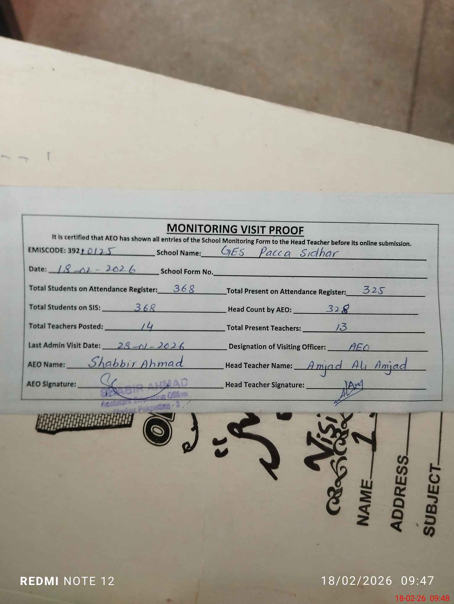 | Attendance Register | Head Teacher | MEA with School | Visit Proof |