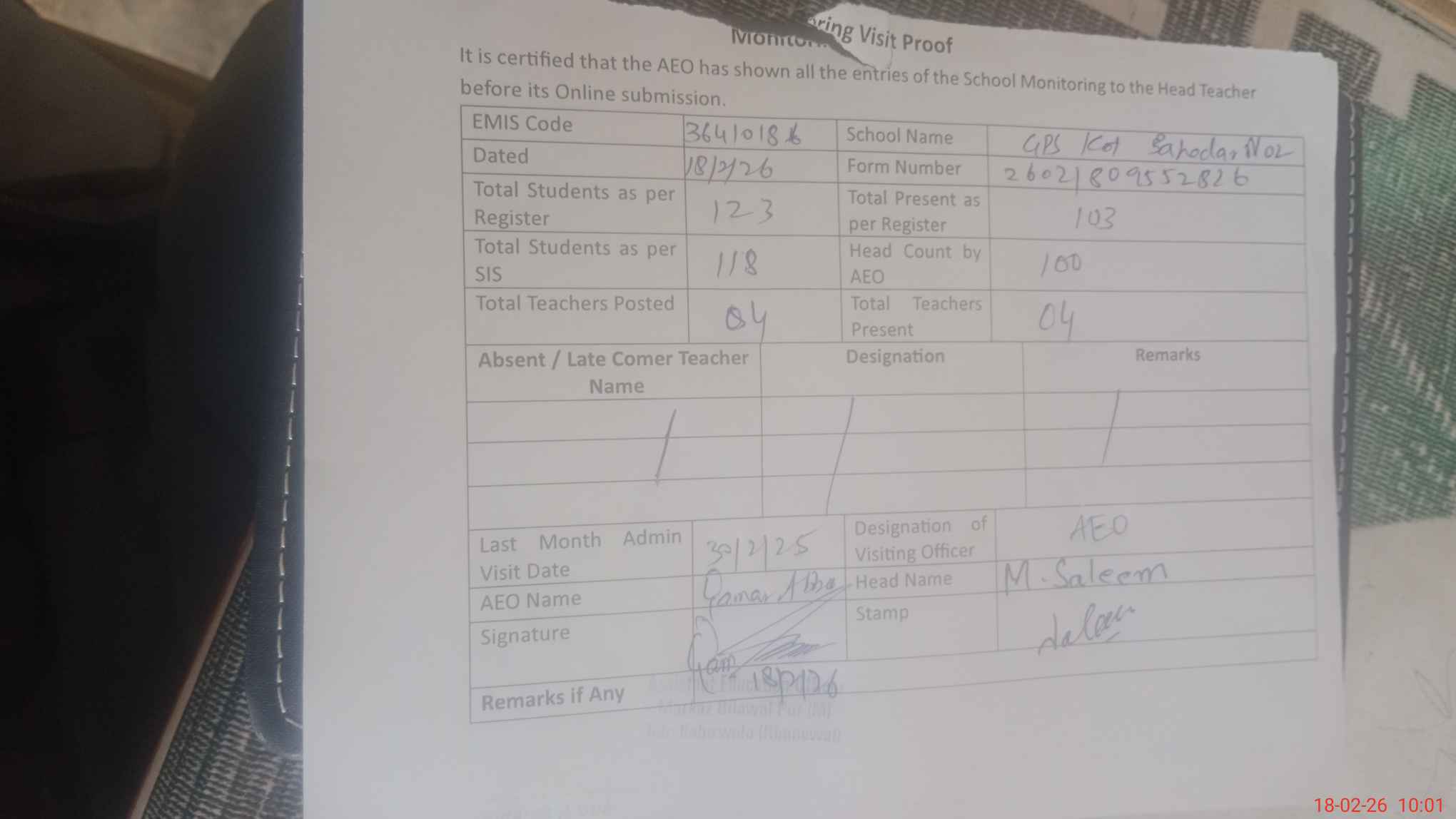 | EMIS Code: 36410186 | Name of School: GPS KOT BAHADUR NO.2 P/O MUBARAK PUR, KABIRWALA | |||