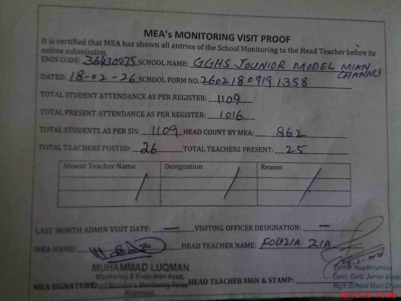 | EMIS Code: 36430075 | Name of School: GGHS JUNIOR MODEL MIAN CHANNU | |||