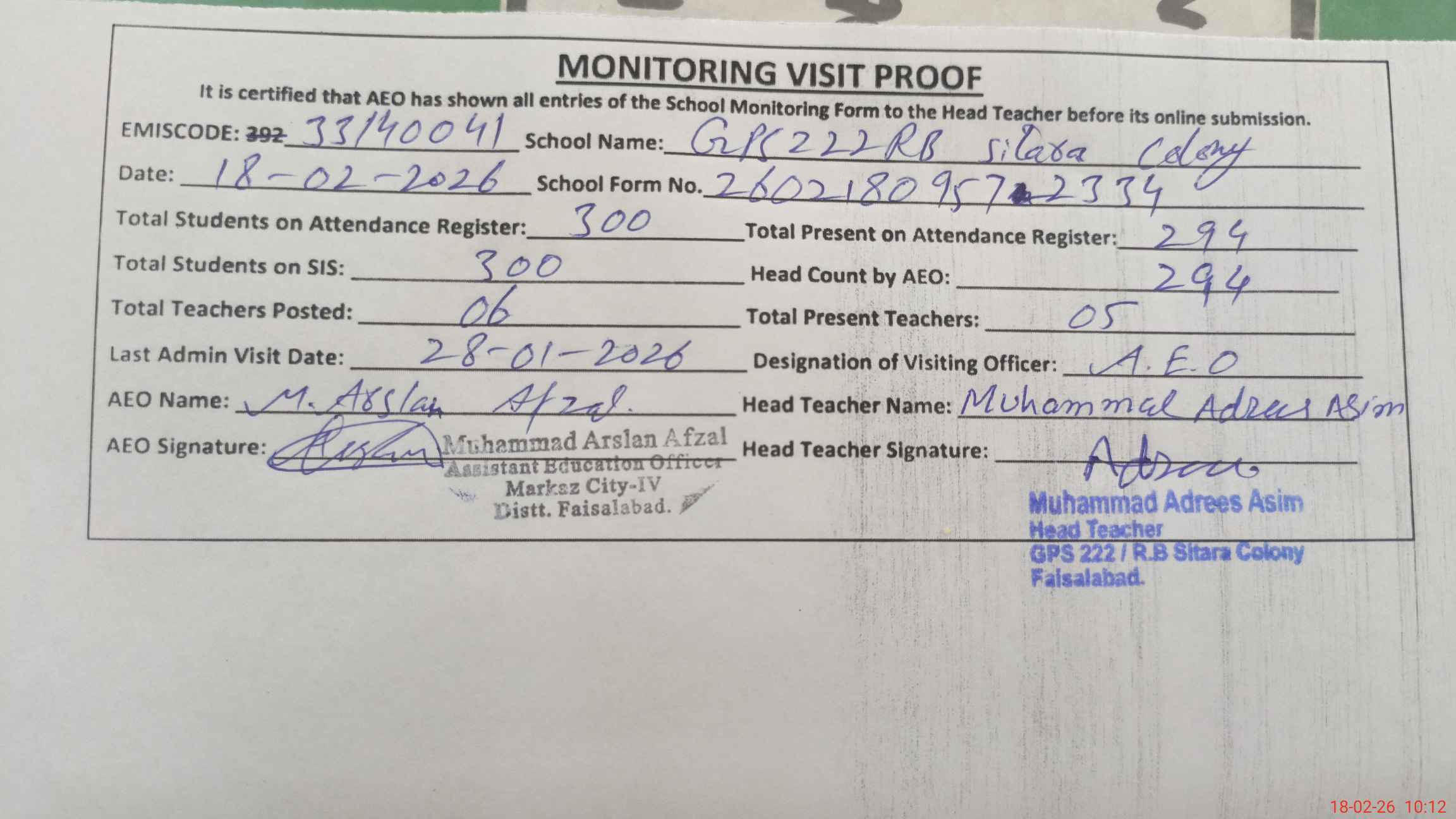 | EMIS Code: 33140041 | Name of School: GPS 222 RB SITRA COLONY | |||