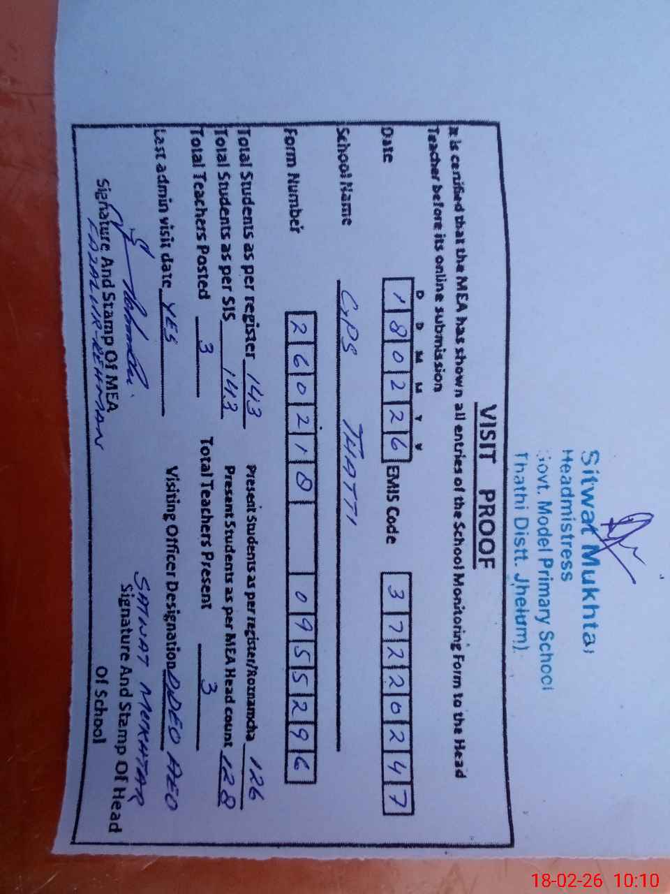 | Certified that this School was Inspected by the Undersigned MEA/DMO Today and the Information Stated Above is as Per Record. | |||||
