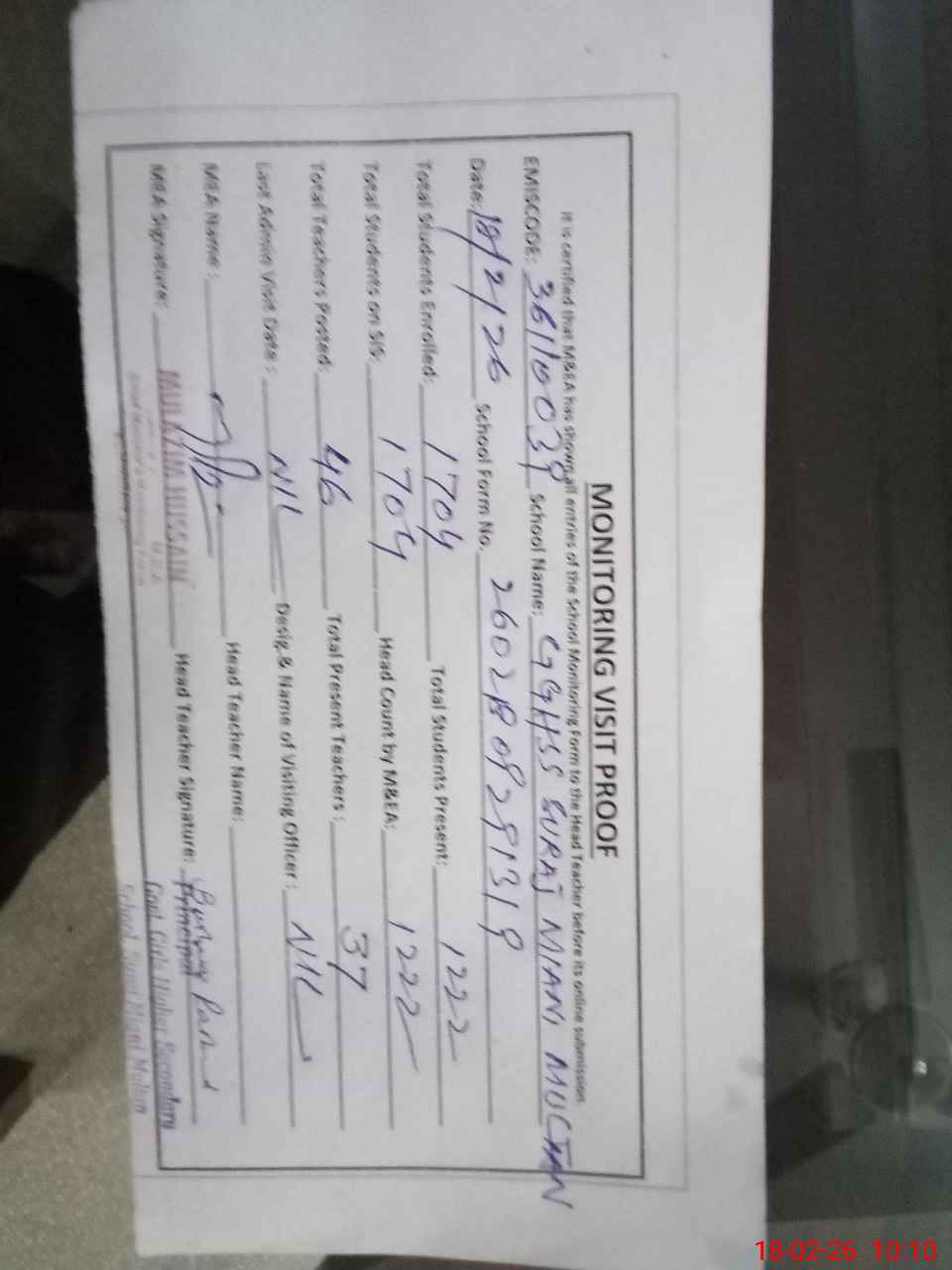 | Certified that this School was Inspected by the Undersigned MEA/DMO Today and the Information Stated Above is as Per Record. | |||||