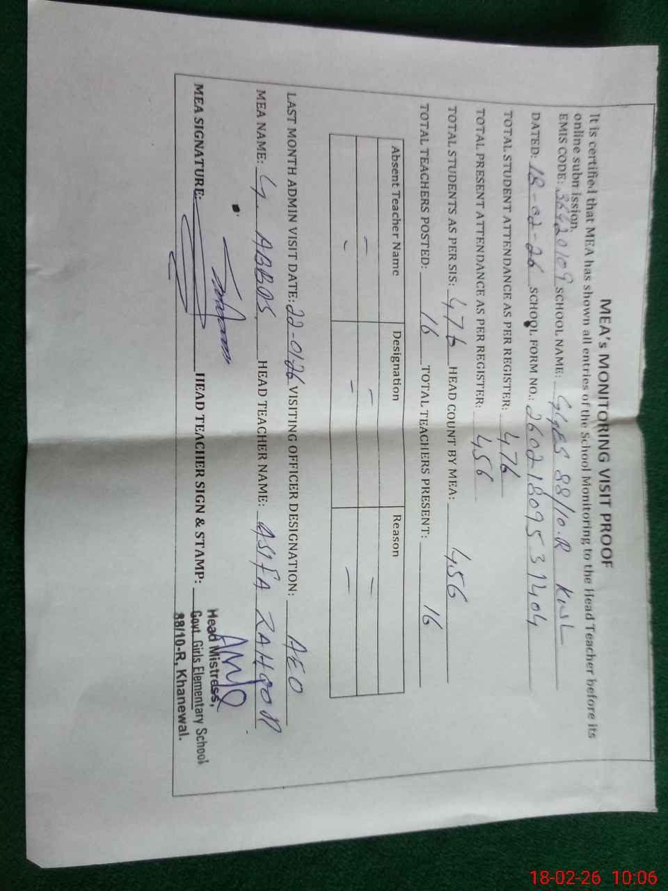 | EMIS Code: 36420109 | Name of School: GGES 88/10-R, KHANEWAL | |||