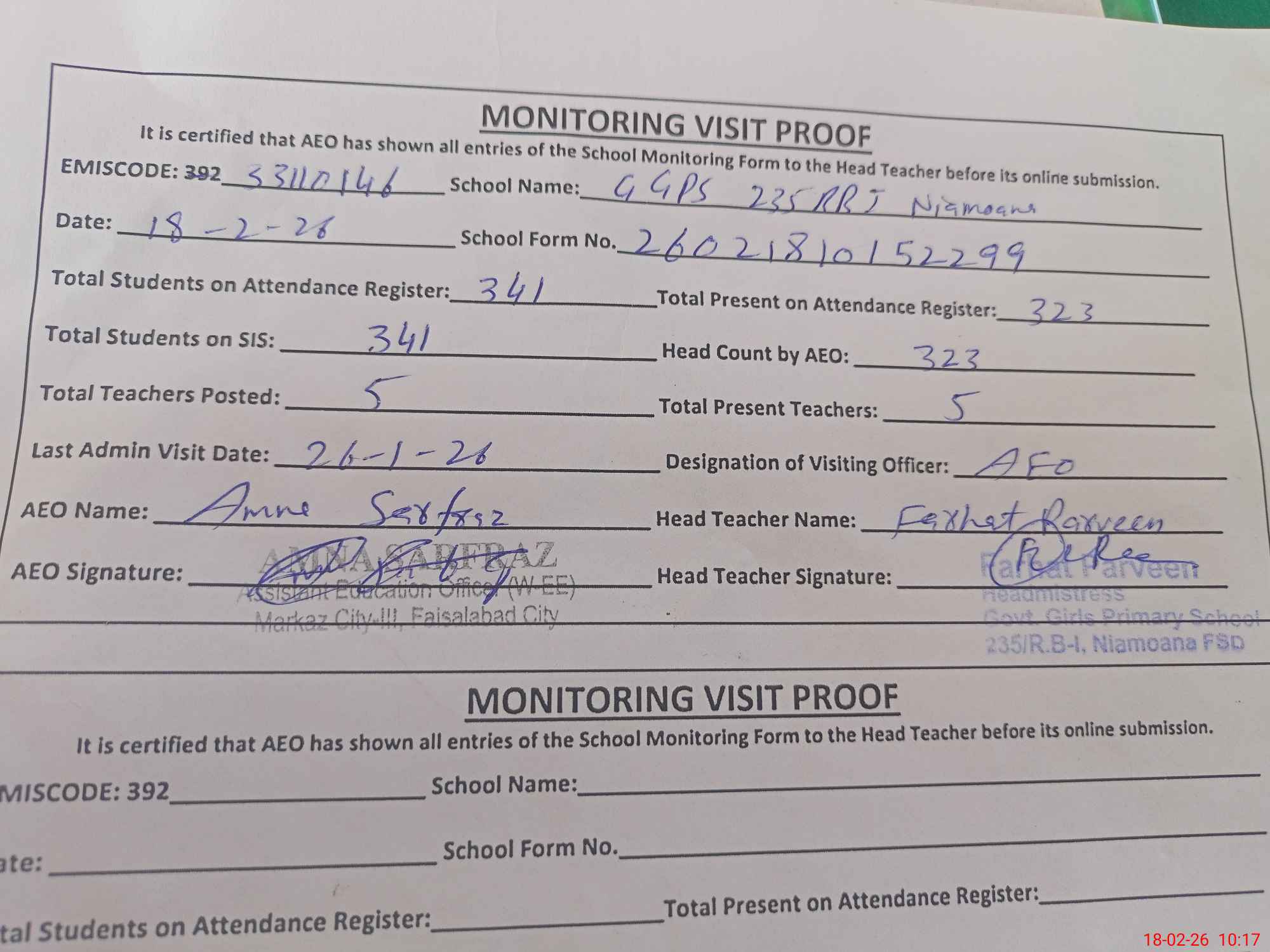 | Monitoring Date: 18-02-2026 | Start Time: 18-02-2026 09:45 AM | End Time: 18-02-2026 10:18 AM | Name of MEA: AM**** SA**** | |