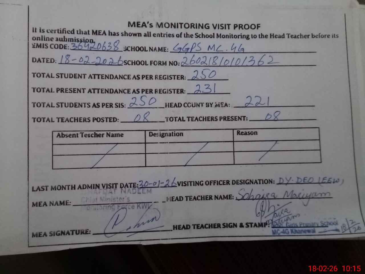 | EMIS Code: 36420638 | Name of School: GGPS MC 4-G, KHANEWAL | |||