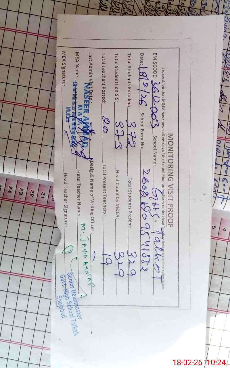 | EMIS Code: 36120003 | Name of School: GHS TALKOT SHUJA ABAD | |||