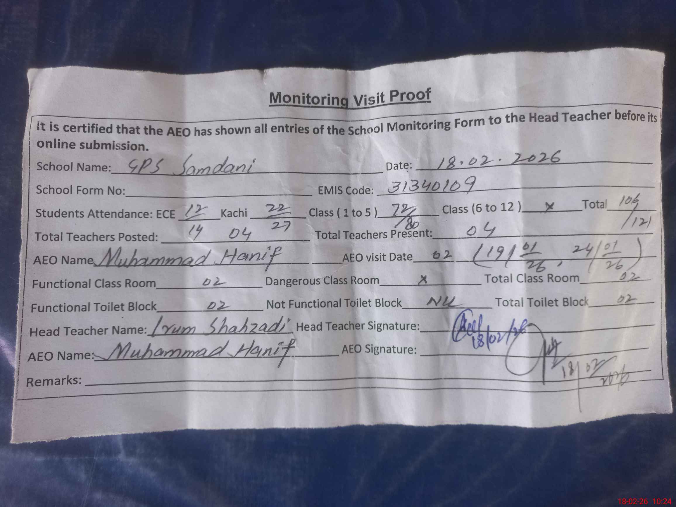 | Remarks (Use Separate Page if Required): There are a total of 2 classrooms . one classroom is for ECCE class . 2 Additional classrooms are required. | |||||
