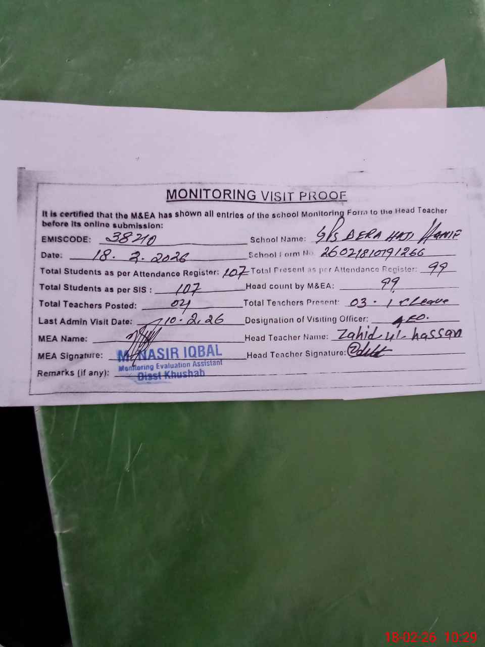 | Attendance Register | Head Teacher | MEA with School | Visit Proof |