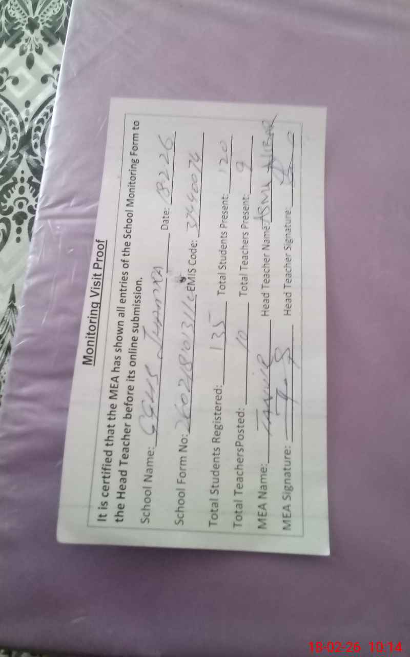 | Attendance Register | Head Teacher | MEA with School | Visit Proof |