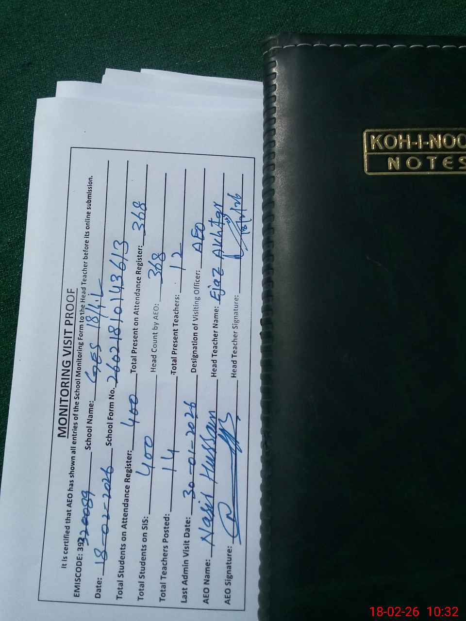 | Attendance Register | Head Teacher | MEA with School | Visit Proof |