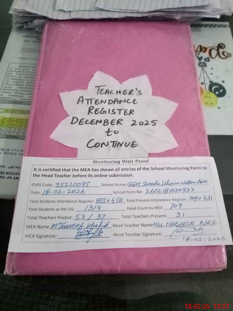 | EMIS Code: 35220095 | Name of School: GGHS SAEEDA ISLAMIA WASSAN PURA SCHEME NO 2 | |||