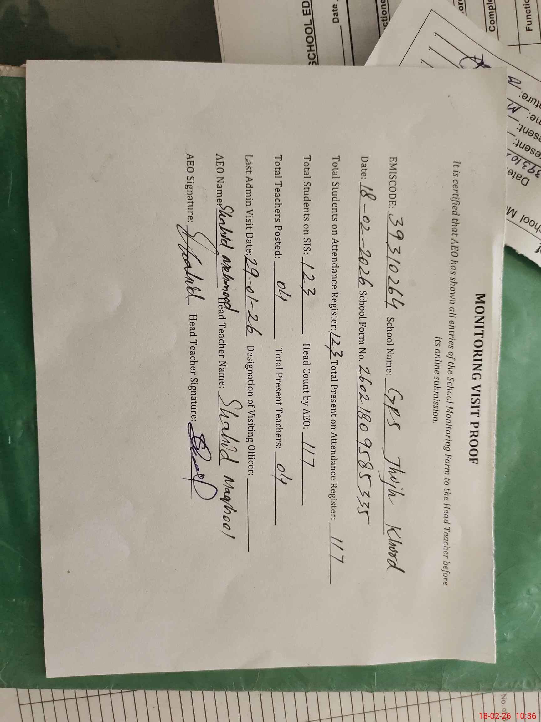 | Attendance Register | Head Teacher | MEA with School | Visit Proof |