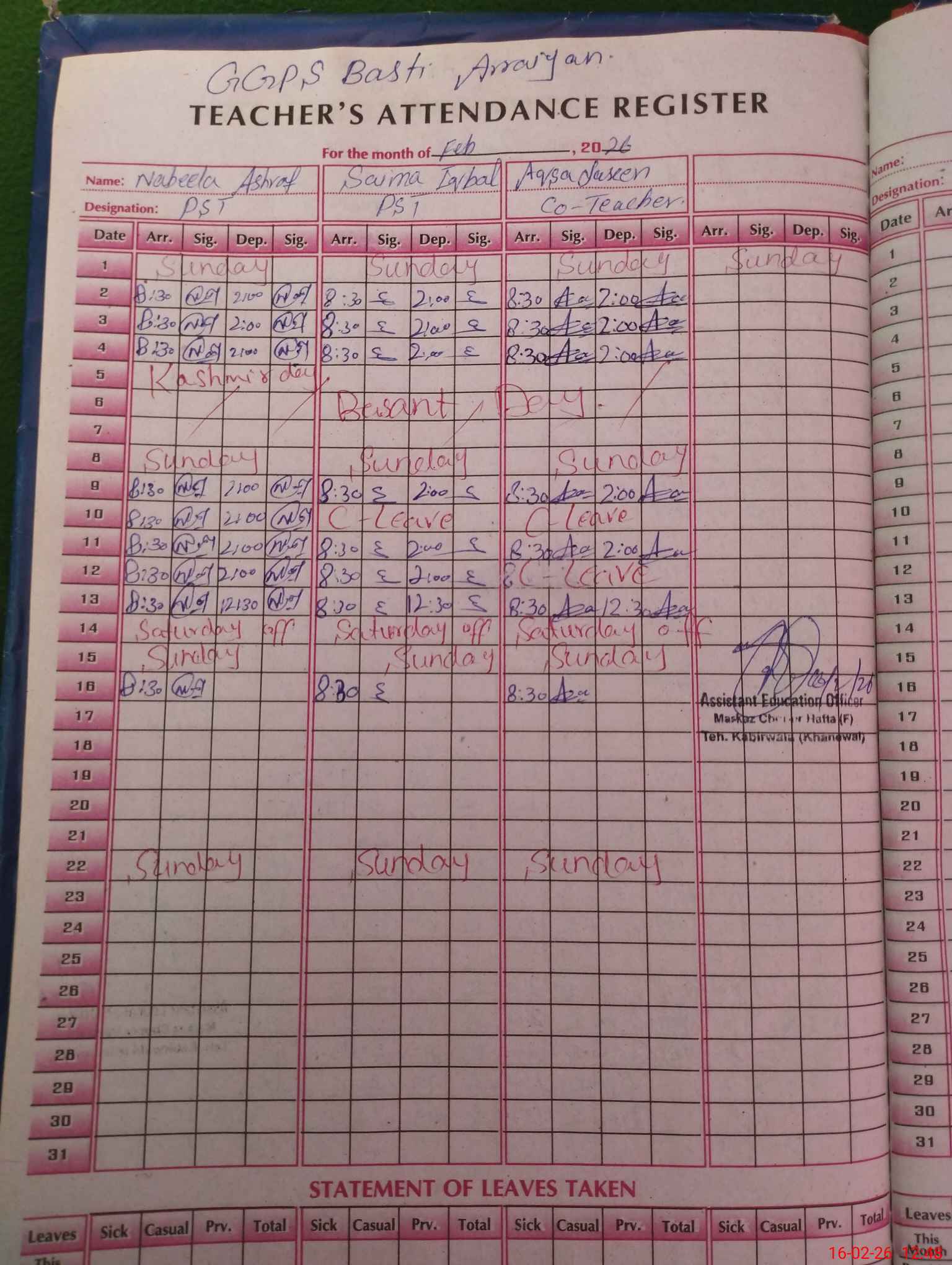 | CNIC | Full Name | Designation | R/C | Absence During Last Calender Month |