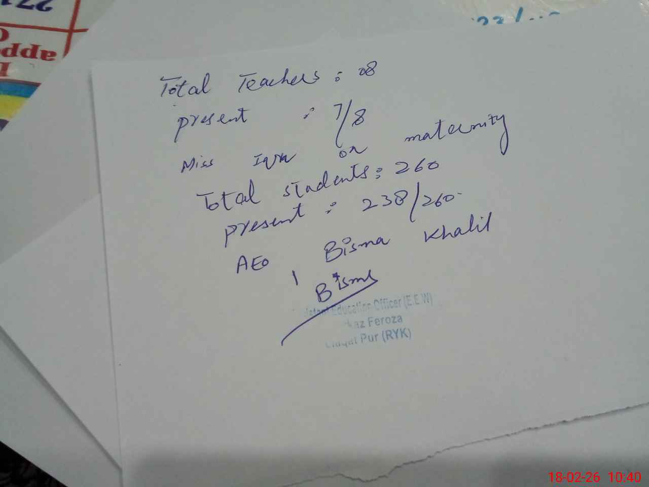 | District: RAHIMYAR KHAN | Tehsil: LIAQATPUR | Markaz: FEROZA - FEMALE | Level: Middle | |