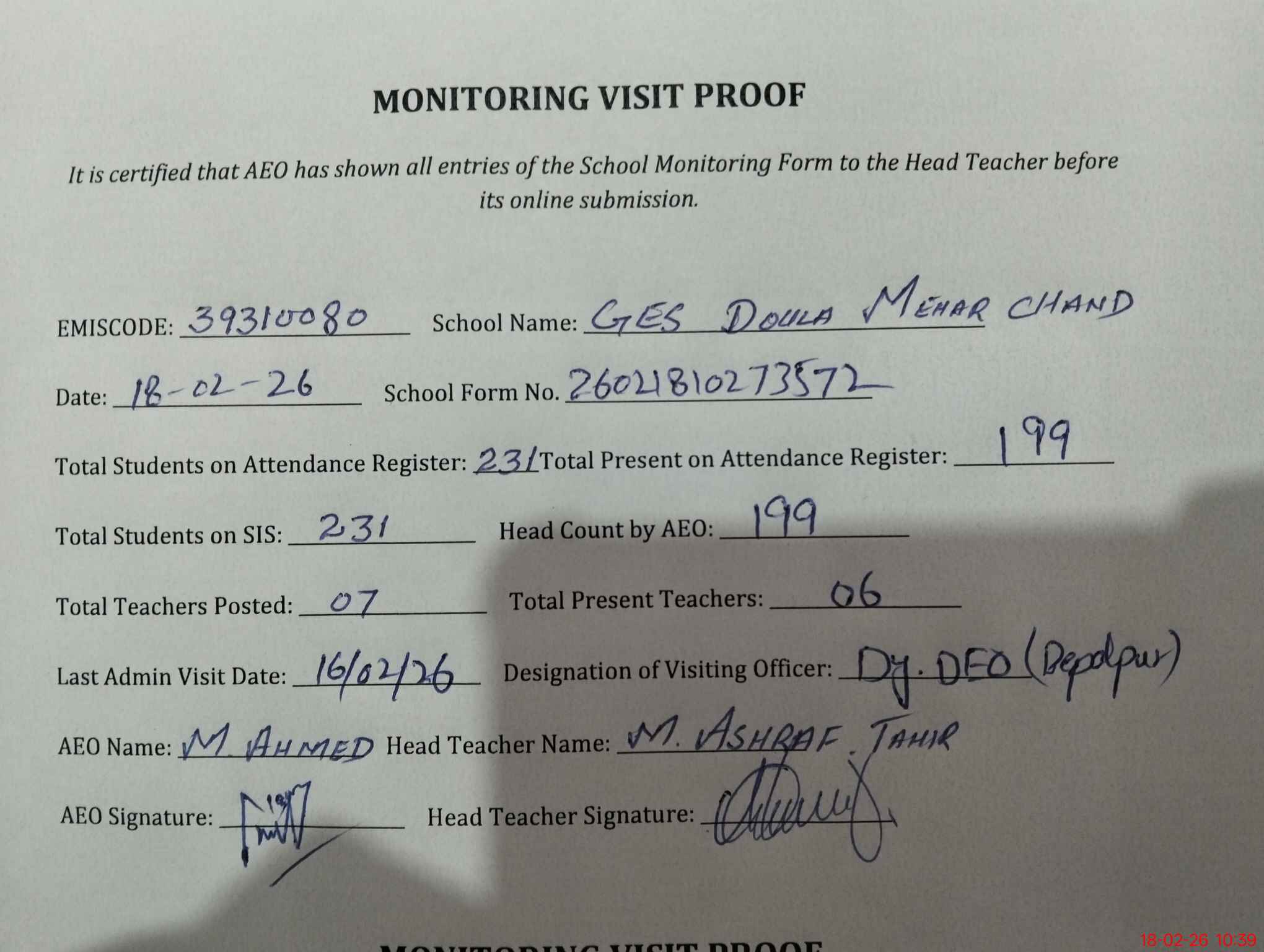 | EMIS Code: 39310080 | Name of School: GES DOULA MEHAR CHAND | |||