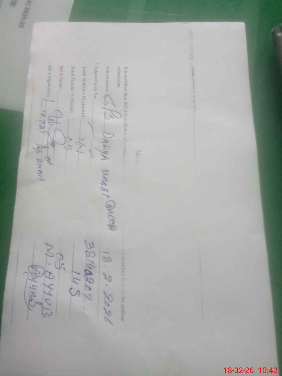 | Certified that this School was Inspected by the Undersigned MEA/DMO Today and the Information Stated Above is as Per Record. | |||||