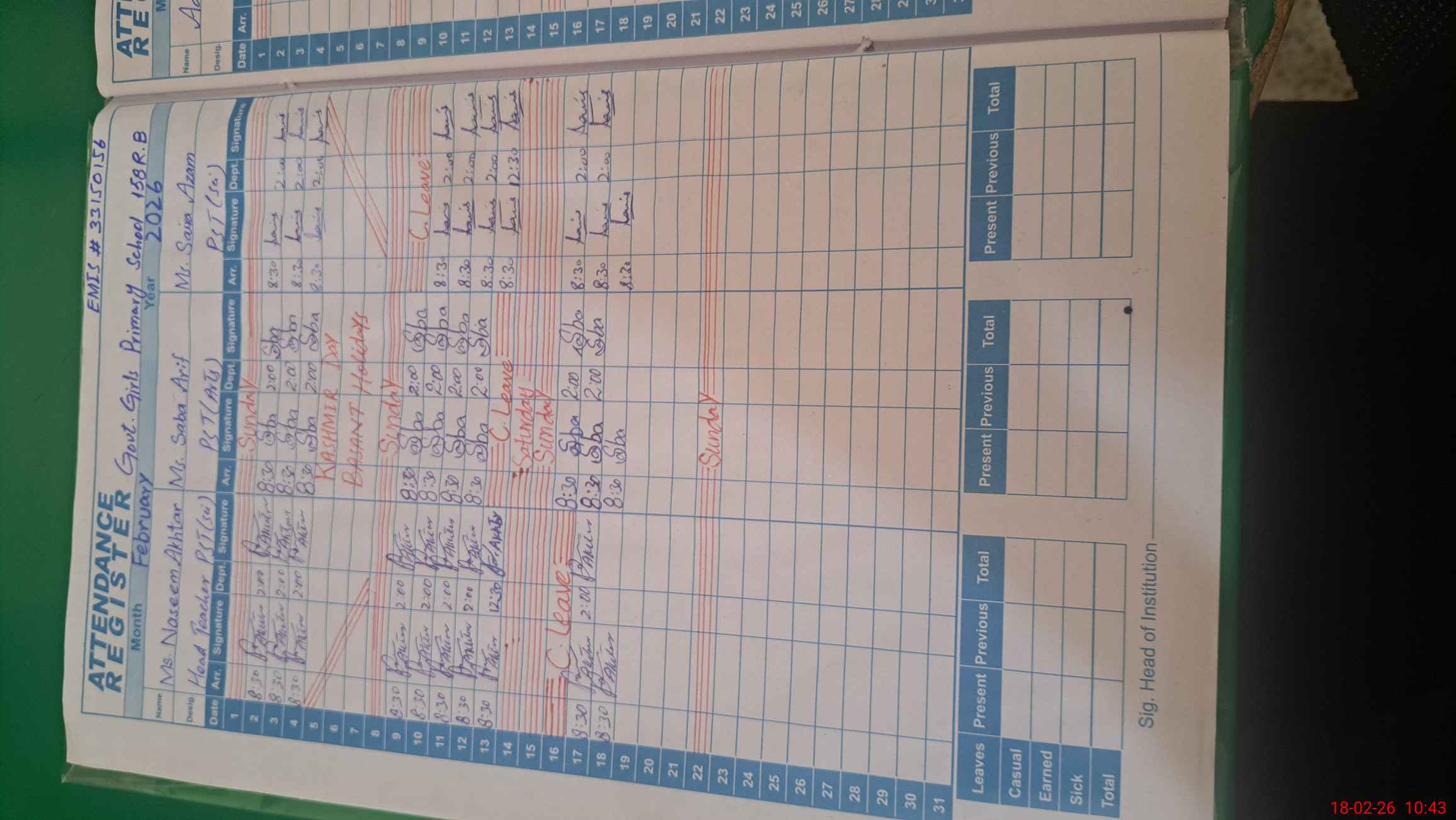 | Leave | Duty | Absent | Maternity | Medical | Ex- Pak |