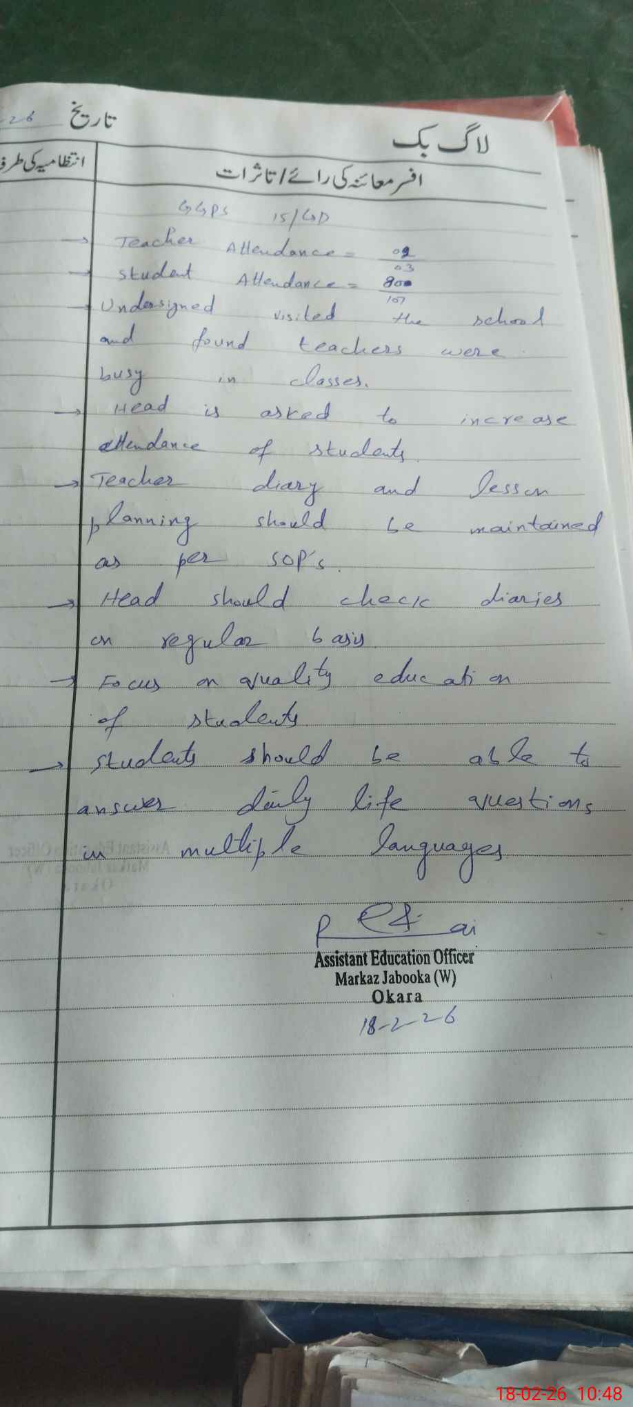 | District: OKARA | Tehsil: OKARA | Markaz: JABOOKA - FEMALE | Level: Primary | |